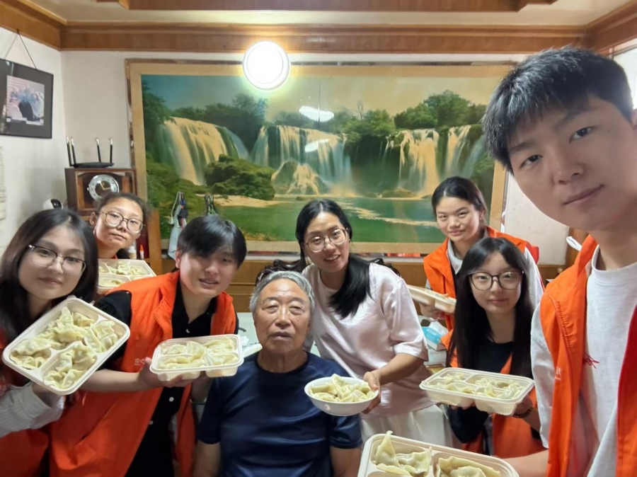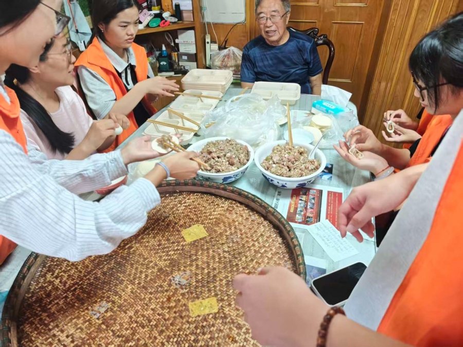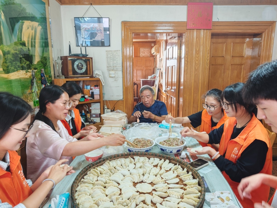 随后,师生志愿者与吴志佳老人一同动手包饺子。大家分工协作,和面、调馅、擀皮、捏饺,动作娴熟又充满热情,不一会儿,一盘盘饱满的饺子便制作完成。待热气腾腾的饺子端上桌,众人围坐在一起共同品尝,在分享美食的过程中畅谈交流,欢声笑语间满是团圆的温馨。活动最后,全体师生与吴志佳老人合影留念,用镜头定格下这一温暖瞬间。