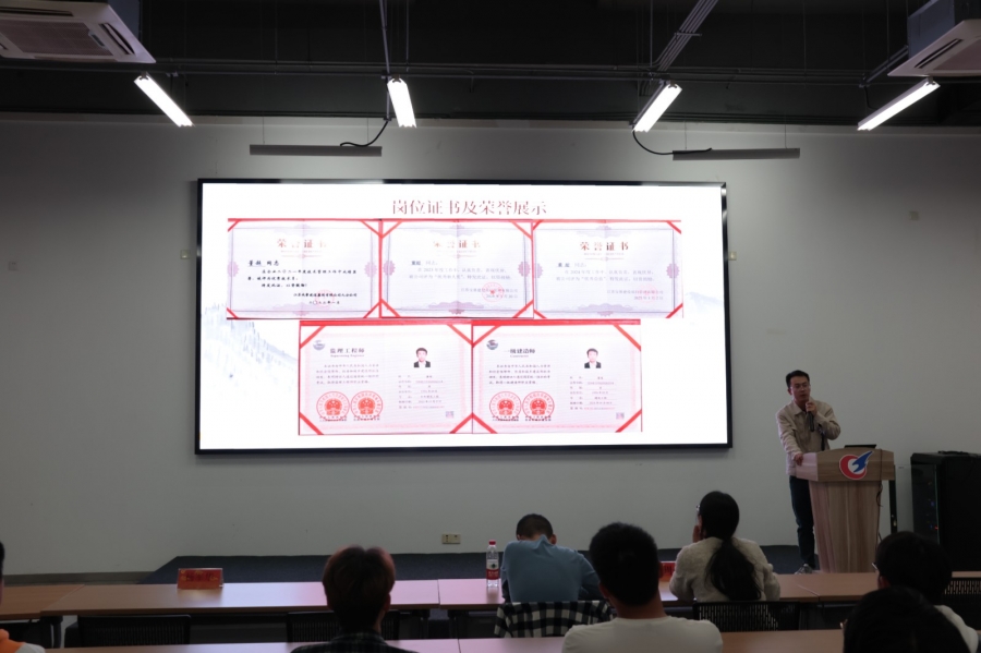 董超以“土木人的八年旅程”为核心,向2025级新生梳理了自己“扎根一线”与“转型管理”的双阶段职业路径。2018年毕业后,董超加入江苏成章建设集团有限公司,从工程项目技术员起步,逐步成长为施工员,在一线坚守五年。他坦言,施工一线无“朝九晚五”,全年无休是常态,体力与毅力的双重考验让他快速成长,这些经历成为职业路上的宝贵“养分”。2023年,董超转型加入江苏宝基建设项目管理有限公司任项目总监,实现从“干好活”到“管好事”的跨越。他强调,转型意味着责任升级,需统筹工程质量、安全、进度全流程,对系统思维与法律意识要求更高。截至目前,他已主导多个重点项目,获评“优秀技术员”“优秀总监”等称号,并考取注册监理工程师、一级建造师、中级工程师证书,用“冰冻三尺非一日之寒,滴水穿石非一日之功”的座右铭诠释坚守的意义。