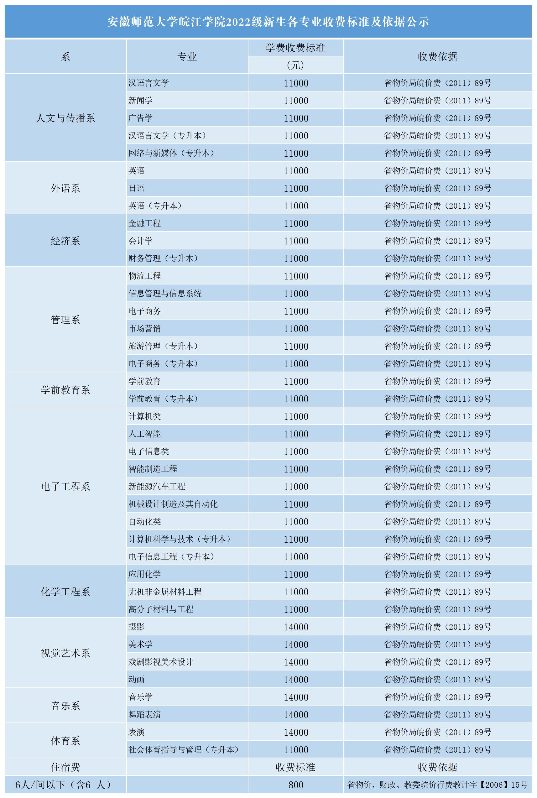 安徽师范大学皖江学院2023年各年级各专业收费标准及依据公示