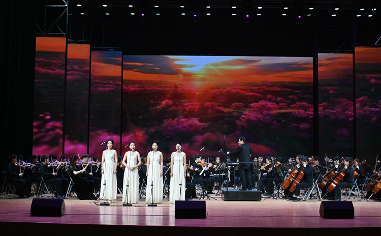 音乐会共由11首交响乐曲组成,由安徽师范大学音乐学院教授、国家一级指挥曹艺阐执棒,为师生们带来了包括女声小合唱、男女声独唱、男女生二重唱,管弦乐、古筝与乐队合奏等精彩节目。演出在气势恢宏的管弦乐《红旗颂》中拉开帷幕,激昂的旋律生动描绘了中华人民共和国成立时五星红旗冉冉升起的壮丽场景,瞬间点燃了现场师生们的爱国热情。随后,由四位表演者带来女声小合唱《映山红》和《万泉河水清又清》。《映山红》以其深情动人的歌词和旋律,将师生们带回到了革命年代,让他们深切感受到了革命先辈们的坚定信念和无私奉献;《万泉河水清又清》则以欢快的节奏展现了军民鱼水情。