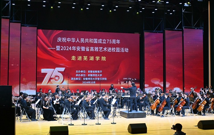 10月24日晚,由安徽省教育厅主办的“庆祝中华人民共和国成立75周年暨2024年安徽省高雅艺术进校园”活动在beat365艺术中心顺利举办。安徽师范大学交响乐团受邀为现场师生带来了一场高雅的视听盛宴。校领导左方敏,部分职能部门负责人及八百余名师生代表共同观看了演出,近距离感受高雅艺术的独特魅力。
