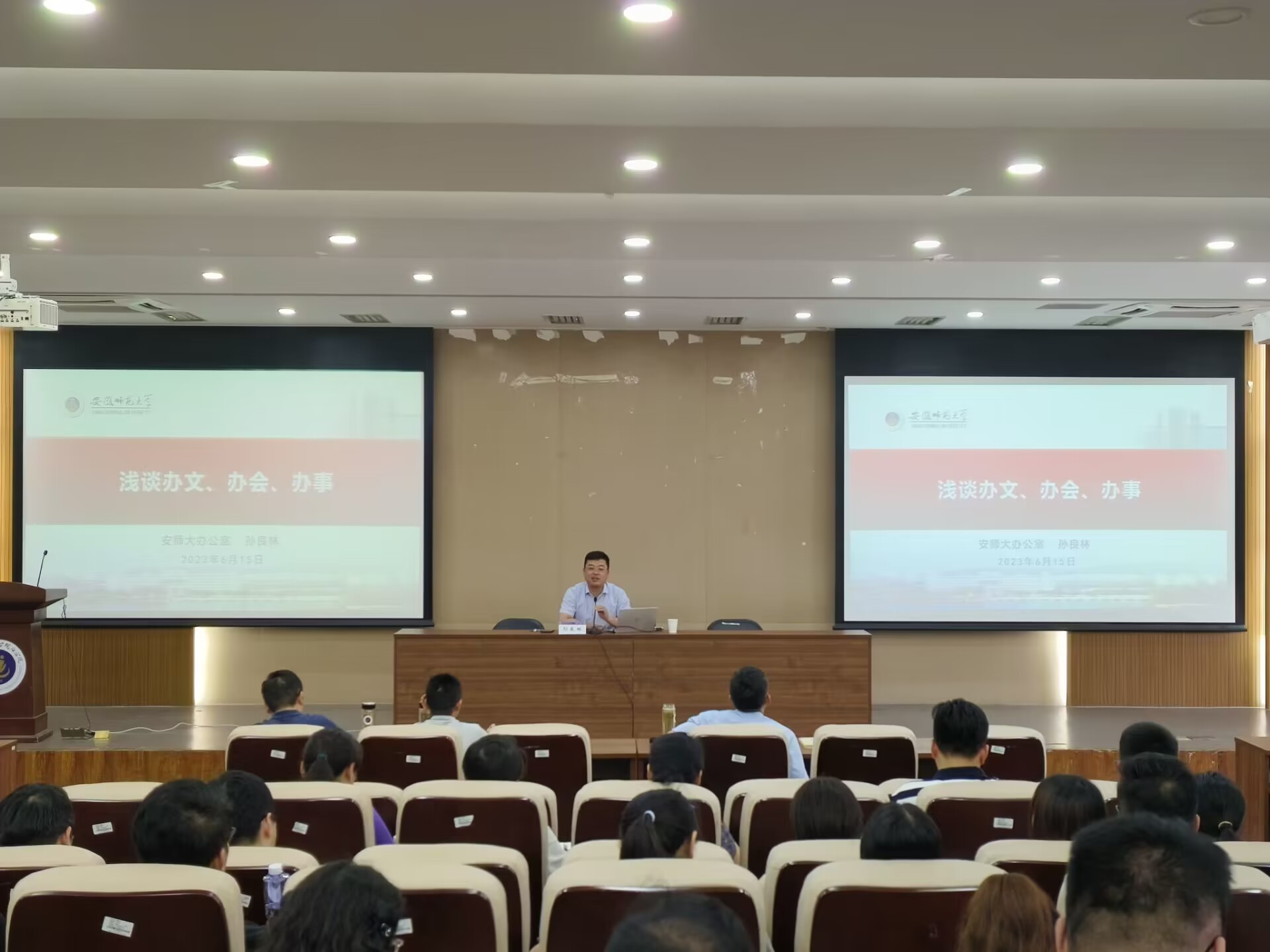 安徽师范大学办公室副主任孙良林围绕“如何提高办文水平”“如何提高办会水平”“如何提高办事水平”为主题,结合自身多年的辅导员工作及机关办文办会办事经验进行专题授课。他以熟练掌握“办文办会办事”技能为切入点,围绕公文运转、公文处理、会务办理等方面,详实讲解工作中容易出现的错误和漏洞,对办事行文规矩、会议流程等细节进行了详细讲解,为辅导员指明工作标准和工作规范,给辅导员带来了很大的启发。最后,孙良林以“每临大事有静气,不信今时无古贤”与大家共勉。