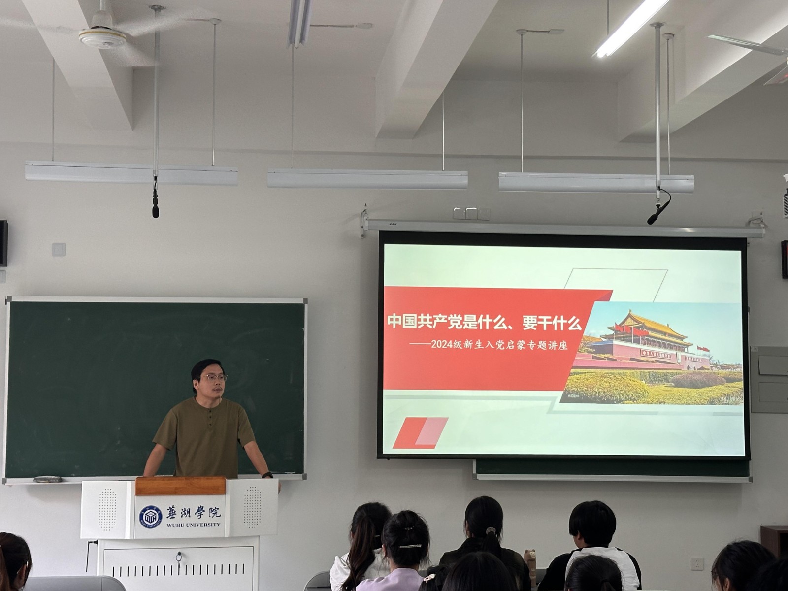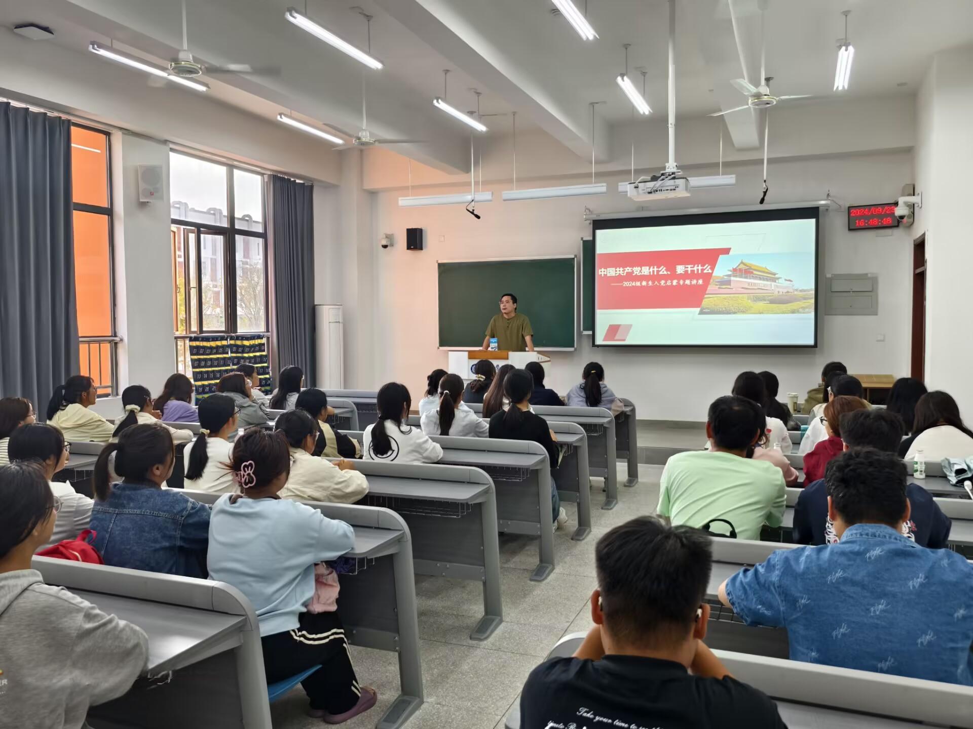 首先,李老师通过对中国共产党历史、现状和发展趋势的讲解,让同学们对党的性质、宗旨、原则及党领导中国人民所取得的伟大成就有了初步了解;并从历史的必然和人民的选择的角度入手,向2024级的新生说明了为什么要入党、申请入党的条件、党员发展流程等方面,并借此鼓励同学们积极向党组织靠拢。最后,李老师强调大学生入党首先要端正入党动机,始终坚持把政治标准放在首位,在思想及行动上入党,要认真学习党的理论知识,肩负起历史赋予的时代使命与担当。