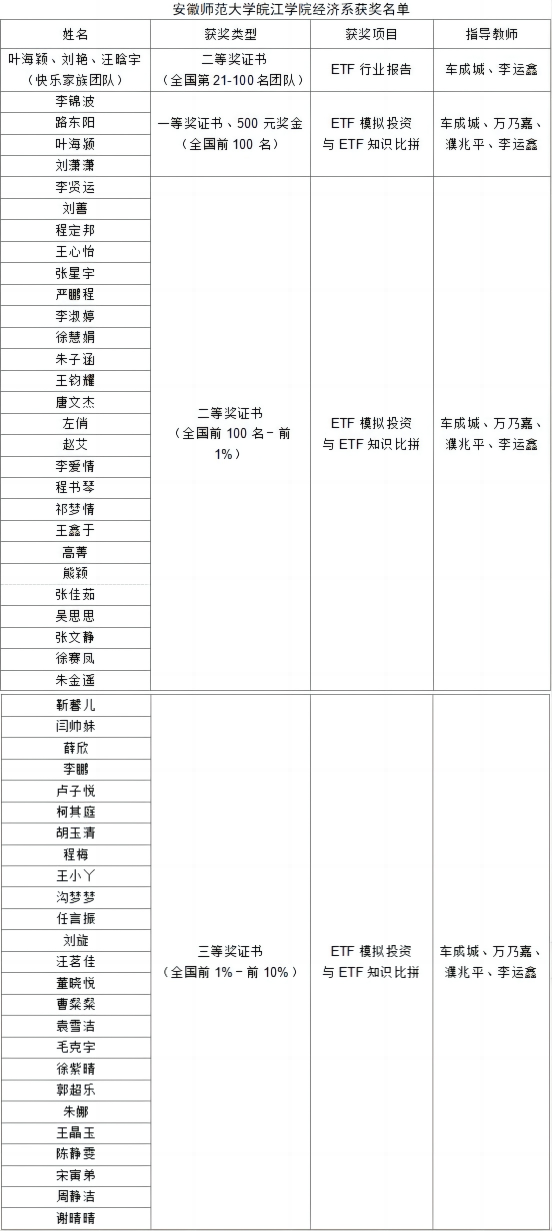其中,在ETF模拟投资与ETF知识比拼赛道中,我系李锦波(2023级财务管理专升本1班)、路东阳(2023级财务管理专升本1班)、刘潇潇(2023级财务管理专升本2班)、叶海颖(2022级金融工程本科)四位同学获得了一等奖证书与500元奖金(全国前100名)。此外,我系还有24名学生获得二等奖证书(全国前100名-前1%),25名学生获得三等奖证书(全国前1%-前10%),43名学生获得优秀奖证书(全国前10%—30%)。