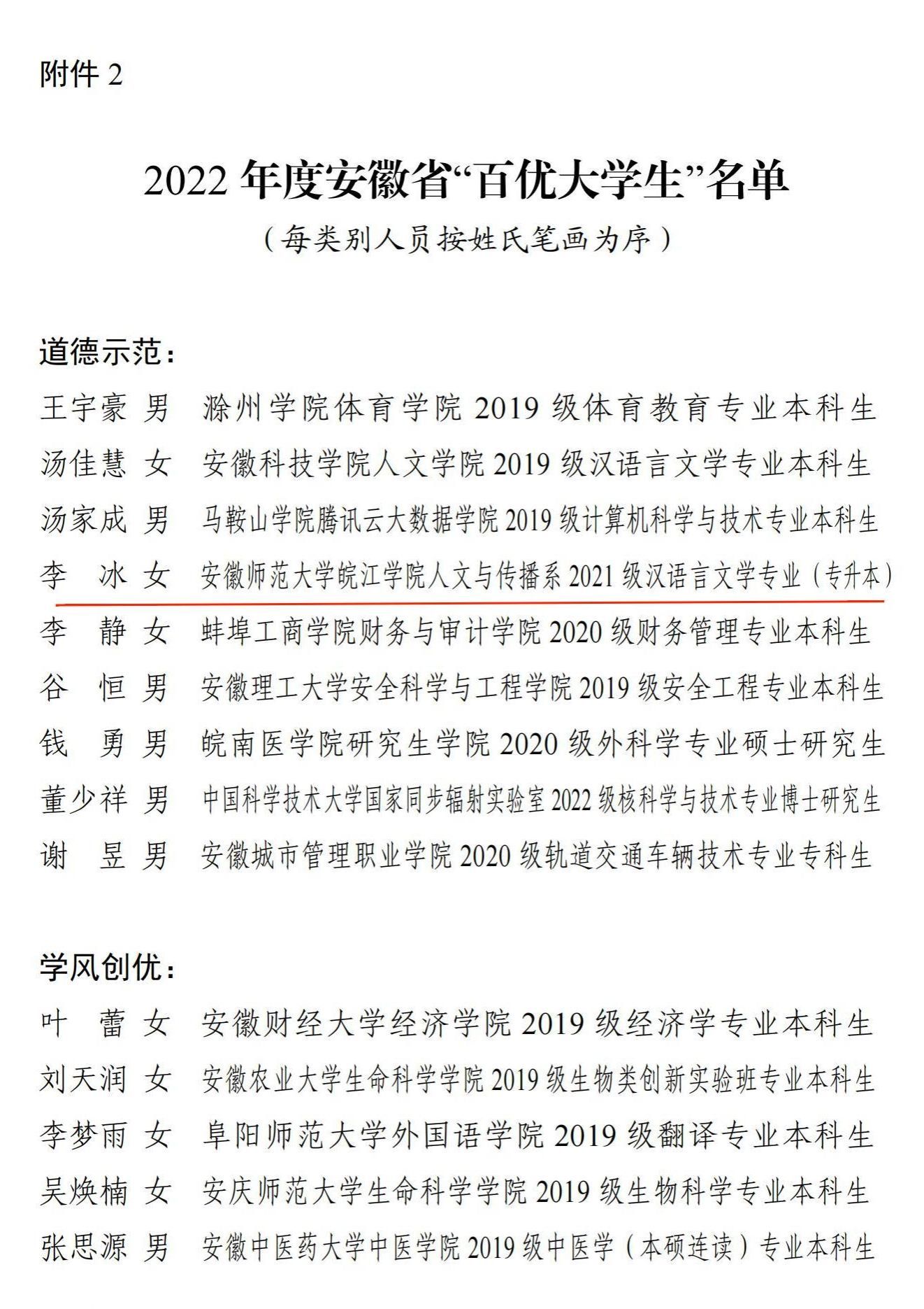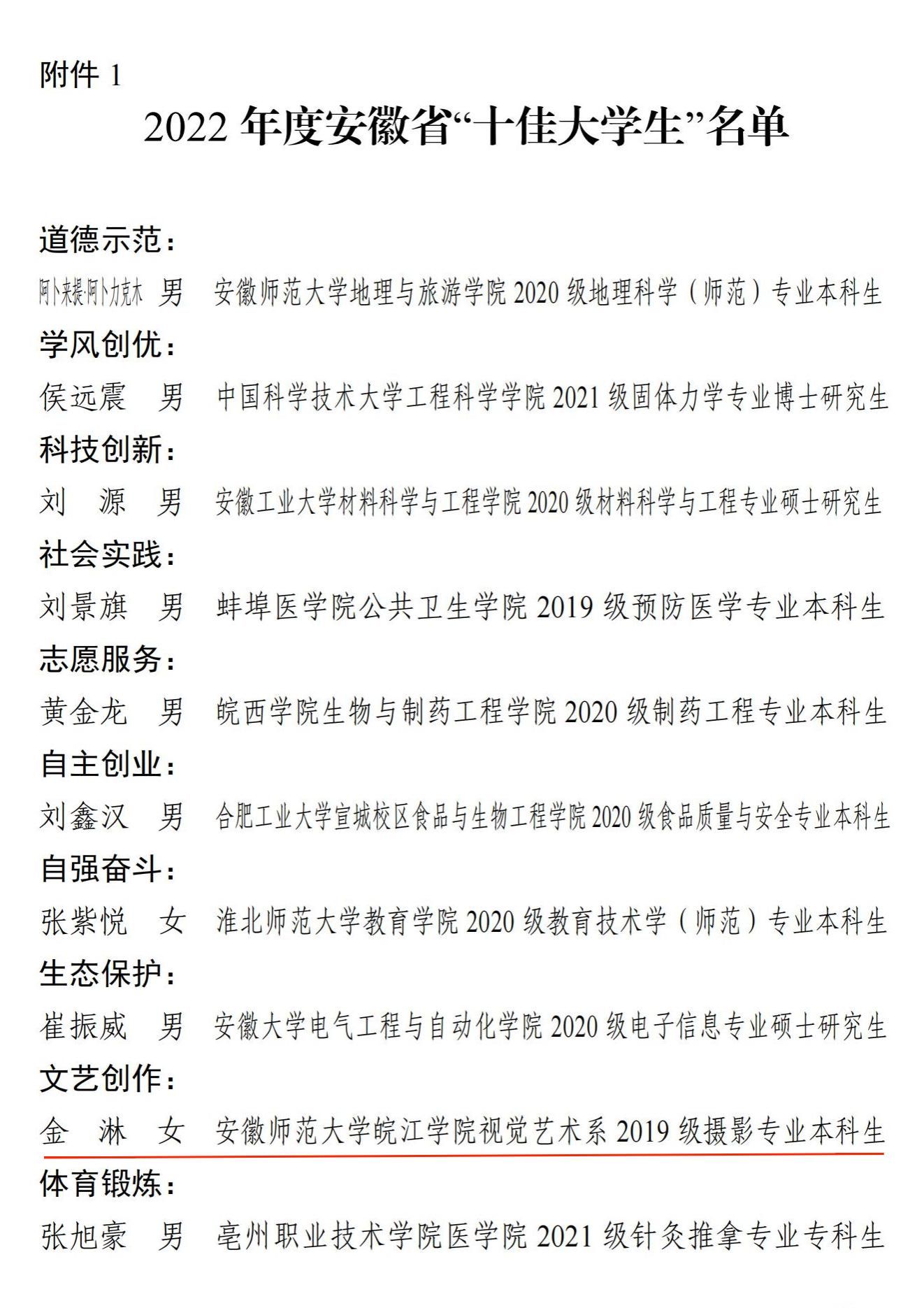 近日,由团省委、省委宣传部、省文明办、省教育厅、省学联等11家单位联合开展的2022年度安徽省“十佳百优大学生”评选活动完美收官。经高校推荐、专家评审、网络点赞、特邀评审团评审,从道德示范、学风创优、科技创新、文艺创作、志愿服务、自主创业、自强奋斗、生态保护、体育锻炼、社会实践等十个方面,选树出“十佳大学生”10名、“百优大学生”90名,我院金淋、李冰同学在文艺创新、道德示范方面脱颖而出,分别获评全省“十佳”、“百优”大学生。