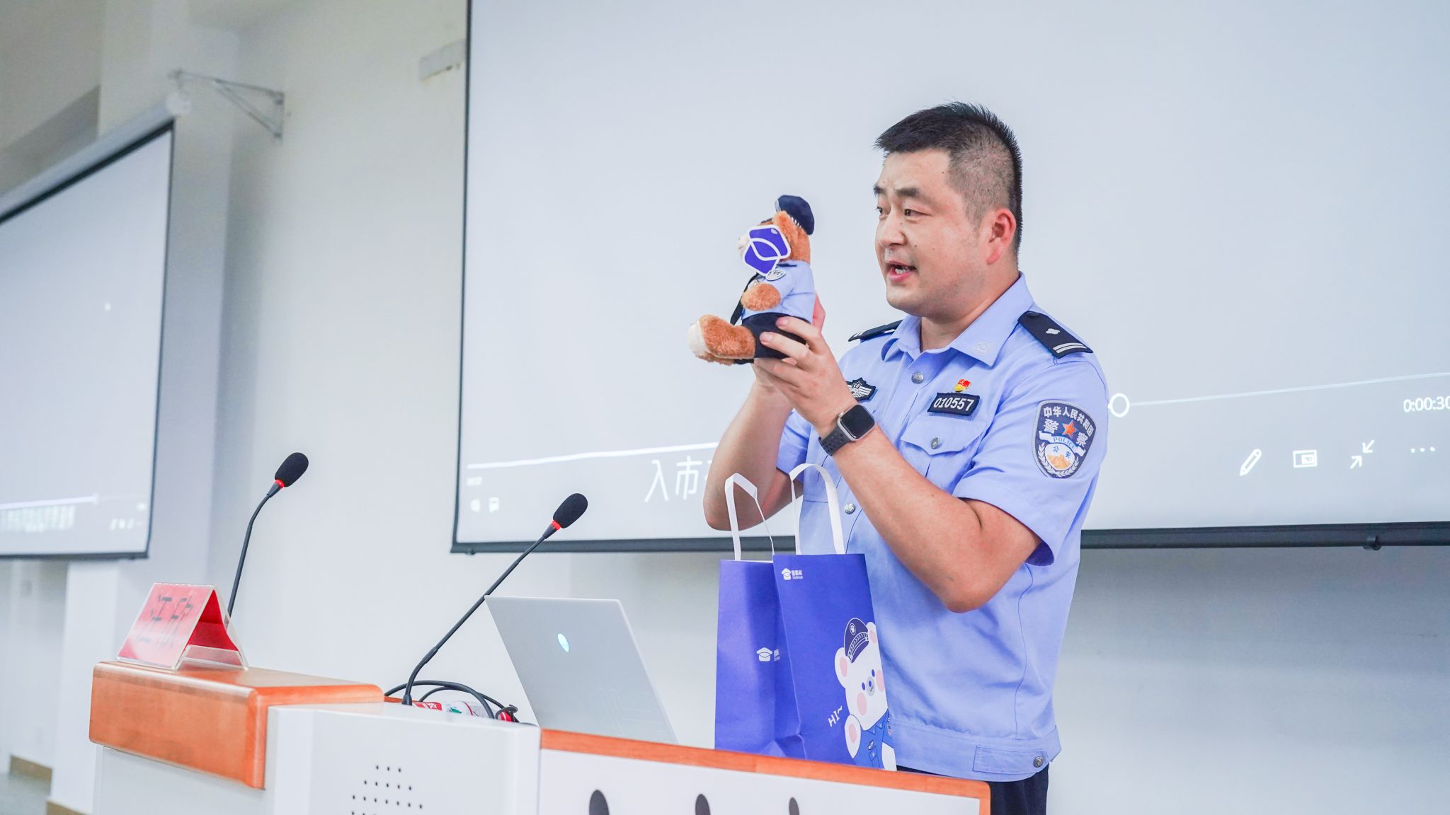 由芜湖市公安局反电诈中心主任汪欣警官主讲的“12355反电诈青课堂”通过线上线下面向全校新生宣传电信防诈知识,从“刷单诈骗”到“杀猪盘”,从“游戏诈骗”到“网络兼职”,同学们在汪警官生动的案例讲解、诙谐幽默的语言中充分认识到电信网络诈骗犯罪的严重危害性,有效增进了同学们对常见的电信网络诈骗类型的了解。活动现场还开展了互动问答环节,同学们踊跃回答提问,同时警官们还为参与问答的同学们准备了“警察小熊”的礼物,现场的新生们反响积极、气氛热烈。