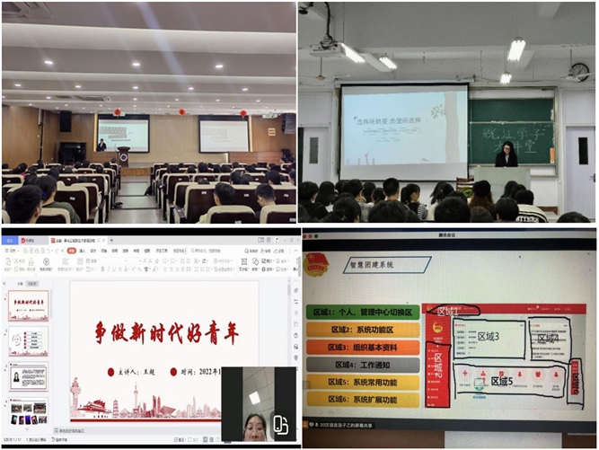 李明月以《关于大学》为主题,鼓励皖江学子要做好大学规划,充实大学生活。范雅琪以《选择所热爱、热爱所选择》为主题,从思想品德、专业学习、学生活动、社会实践、志愿服务等方面分享了她在大学生活中的所经、所想、所思、所感,以其自身经历向同学们讲述要“如何过好大学生活”。王超、汤子乙分别以《学习二十大,争做新时代好青年》《智慧团建系统操作经验交流》为主题,开展线上讲座,她们结合自身具体的工作实践,分享青年学生要努力学习,踏实做事,在具体工作实践中提能力、长本领。