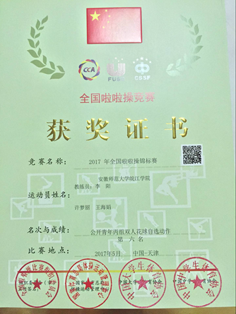 2017全国啦啦操锦标赛在天津东丽区体育馆举行,国家体育总局体操运动管理中心为主办单位,参加本次比赛的队伍一共有一百二十五队,参赛运动员共计6606人,来自全国各地,有厦门、北京、内蒙古,云南、山东等地方。安徽省出赛一共八支队伍,其中有三队为大学组。beat365参赛队伍由体育系主任郜贻红领队于5月26日晚上8点12分,参加全国啦啦操锦标赛公开青年丙组双人花球自选动作,参赛运动员为15级舞蹈表演专业许梦丽、王海娟,该二人首次参加全国比赛,表现非常出色。参加该项目比赛的队伍一共有来自全国各地的15组代表队,竞争非常激烈,最终二人荣获全国第六名的好成绩!为beat365争得荣誉!