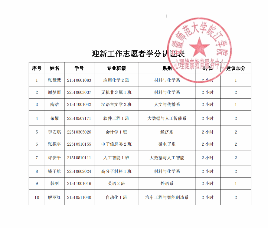 迎新工作志愿者学分认证表