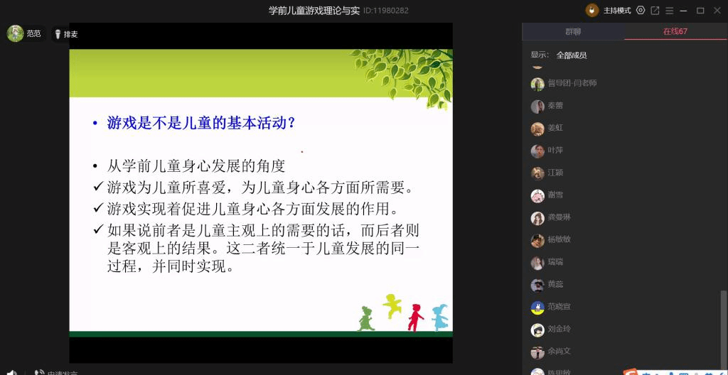 为帮助青年教师专业成长、了解教师教学实际,2020年4月21日上午,学院教学督导团加入学前教育系青年教师范显芬的直播课堂,与2018级学前教育专业全体同学共听《学前儿童游戏理论与实践》课程。