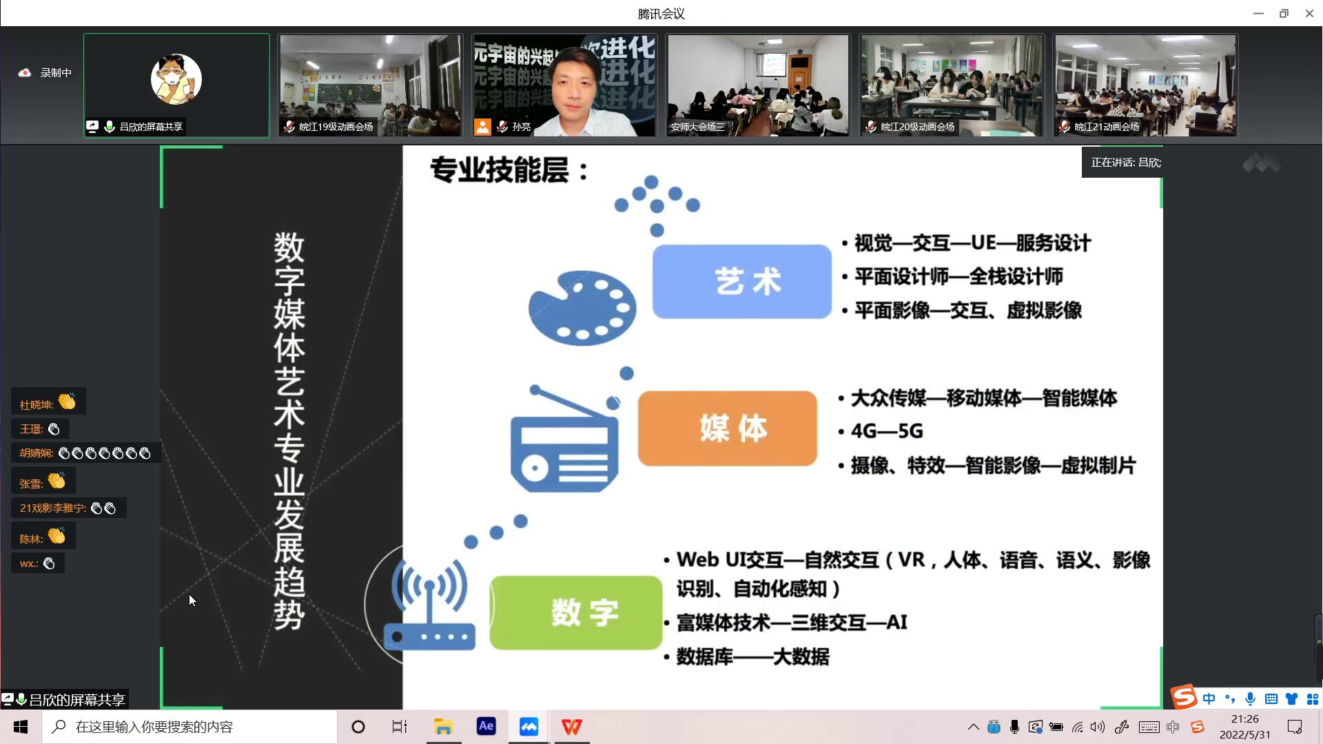 5月31日,中国传媒大学动画与数字艺术学院教授、博士生导师吕欣教授受邀通过线上直播形式为我系师生开展了主题为“元宇宙的兴起与互联网的再次进化”的专题讲座。此次讲座由视觉艺术系党总支书记孙亮教授担任主持,我系全体教师、动画专业学生聆听讲座。